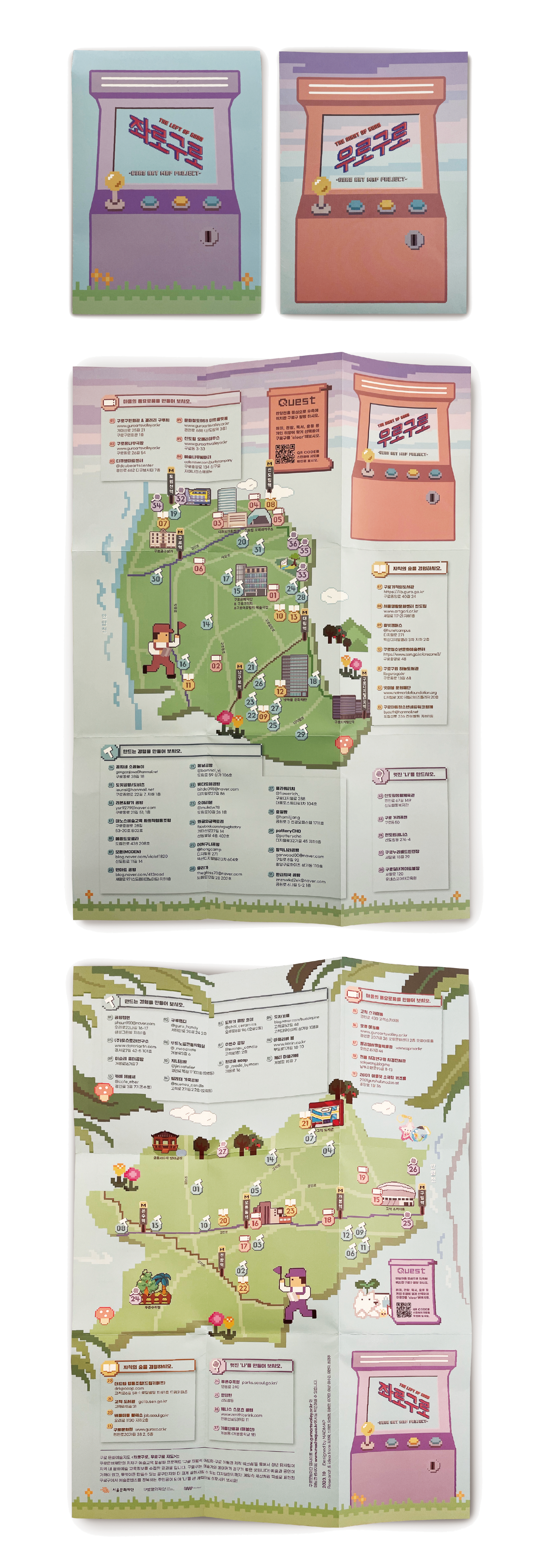 구로구의 특징으로 이야기했던 구로디지털단지와 넷마블 그리고 구로공구단지 등 뚝딱뚝딱 뭔가를 만들어내는 메이커의 느낌으로 컨셉을 잡아보고자 했습니다. 때문에 게임속의 구로구처럼 지도를 만들어 게임의 퀘스트를 하나씩 깨듯 구로구의 예술공간, 문화공간을 들러볼 수 있도록 디자인하고자 했습니다. 그 이야기가 담긴 지도를 들고 구로구를 탐방해보세요 :)